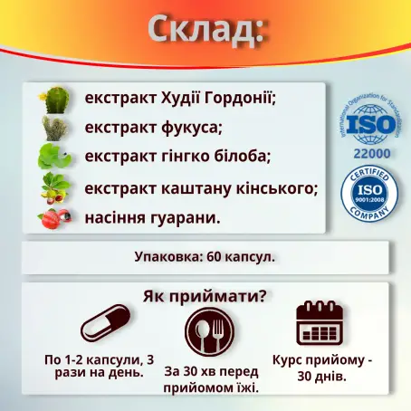 экстракт Худии Гордонии, экстракт фукуса, экстракт гинкго билоба, экстракт каштана конского, семена гуарана.