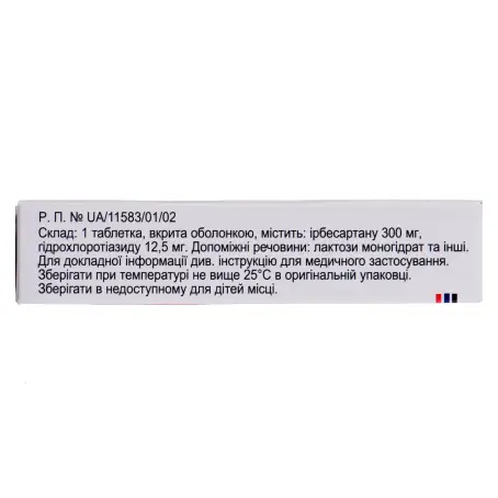 1 таблетка, покрытая оболочкой, содержит ирбесартана 150 мг и гидрохлоротиазида 12,5 мг или ирбесартана 300 мг и гидрохлоротиазида 12,5 мг;