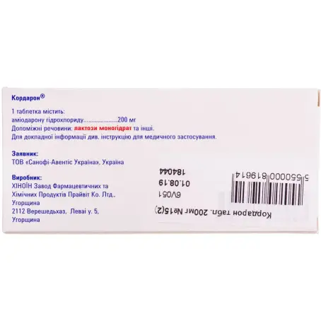 1 таблетка содержит гидрохлорида амиодарона 200 мг;