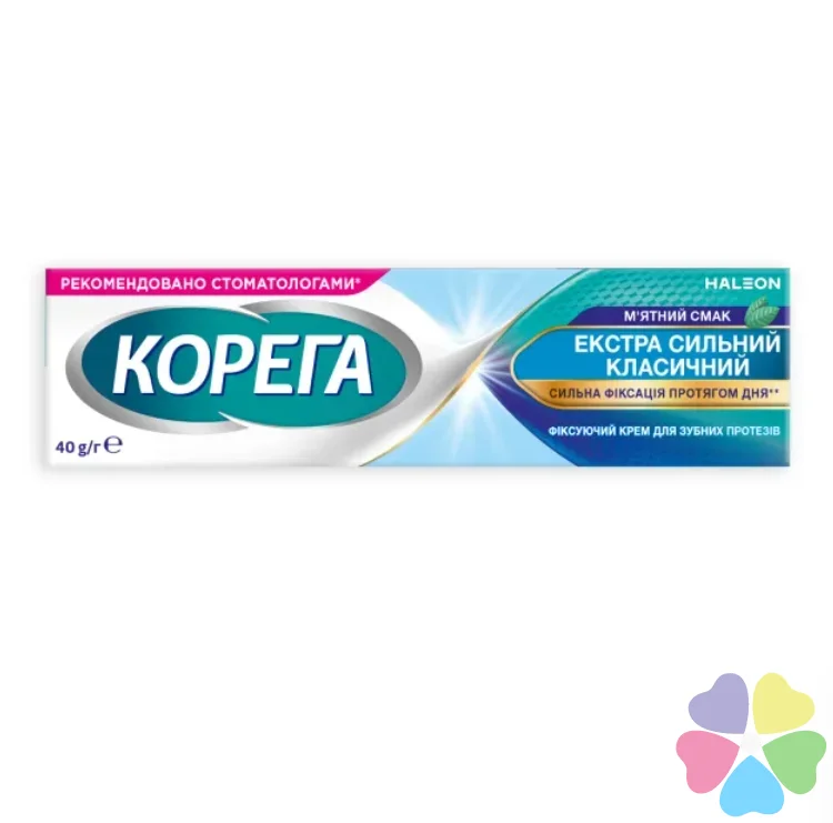 Крем для фиксации зубных протезов Корега Экстра Сильный Мятный вкус, 40 г можно купить в наших аптеках сейчас здесь: Регенераторная, Комфортаун, Дарницкая площадь, Комфорт Таун, Илая Фемили, Бассейна 23, Александровская Больница, Софиевская Борщаговка, Счастливая, Франка, Львов, Грінвіль, Мазепи, Замарстыновская, Черновола Львов, Авалон Львов, Руданского, ЖК Фамилия, Кульпарковская, Малоголосківські пагорби