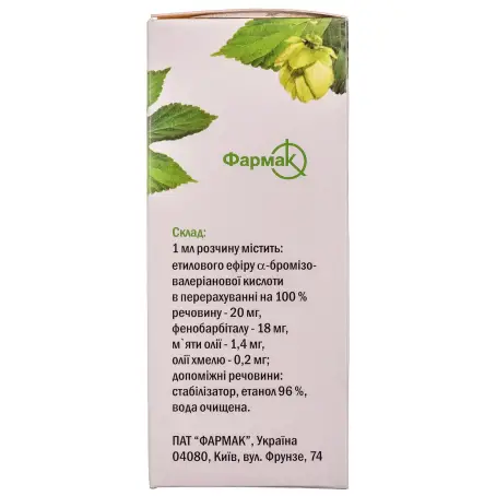 1 мл раствора (26 капель) содержит: этилового эфира a-бромизовалериановой кислоты в пересчете на 100% вещество - 20 мг, фенобарбитала - 18 мг, мяты масла - 1,4мг, масла хмеля - 0,2 мг;