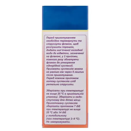 Условия хранения. Хранить при температуре не выше 30 С в оригинальной упаковке. Приготовленную суспензию хранить в течение 7 суток при температуре не выше 25 С или 14 суток в холодильнике (при температуре 2-8 С. Не замораживать).
