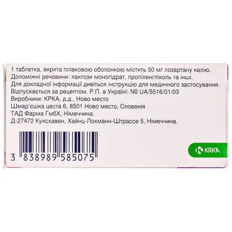 1 таблетка, покрытая пленочной оболочкой, содержит 12,5 мг или 25 мг или 50 мг или 100 мг лозартана калия;