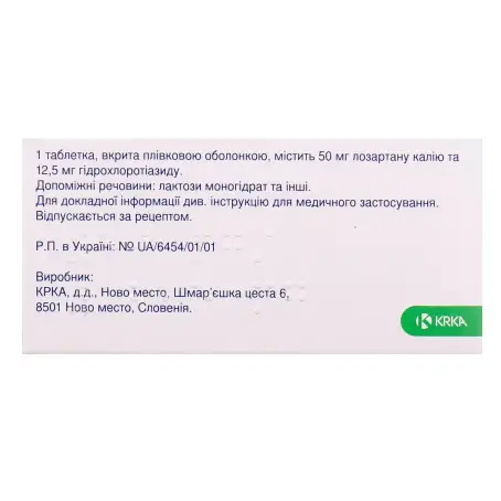 Состав:действующие вещества: лозартан, гидрохлоротиазид;1 таблетка, покрытая пленочной оболочкой, содержит 50 мг лозартана калия и 12,5 мг гидрохлоротиазида;