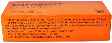 1 таблетка містить магнію оротату дигідрату 500 мг (що відповідає 2,7 мвал, 1,35 ммоль або 32,8 мг магнію);