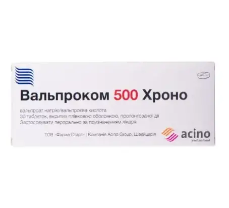 Состав: 1 таблетка содержит вальпроата натрия 333 мг, вальпроевой кислоты 145 мг (что эквивалентно вальпроату натрия 500 мг) (Natrii valproatum)
