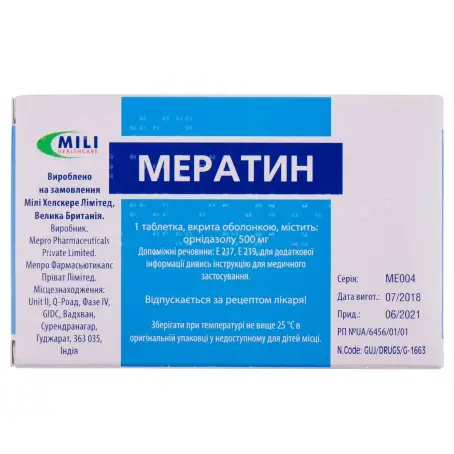 Основные физико-химические свойства: белые, круглые, двояковыпуклые, покрытые оболочкой таблетки, с тиснением «500» с одной стороны и «MERATIN» с другой стороны.