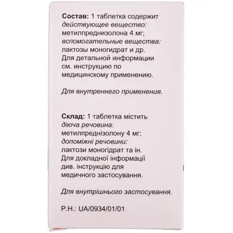 1 таблетка содержит метилпреднизолон 4 мг или 16 мг;