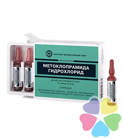 Фармакокінетика. Початок дії на шлунково-кишковий тракт відзначається через 1-3 хвилини після внутрішньовенного введення і через 10-15 хвилин після внутрішньом’язового введення. Протиблювальна дія зберігається протягом 12 годин. З білками плазми крові зв’язується 13-30 % препарату. Об’єм розподілу – 3,5 л/кг. Проникає крізь гематоенцефалічний і плацентарний бар’єри, у грудне молоко. Метаболізується у печінці. Т ? – 4-6 годин. Частина дози (близько 20 %) виводиться у початковій формі, а решта (близько 80 %) після метаболічних перетворень печінкою виводиться нирками у сполуках із глюкуроновою або сірчаною кислотою.