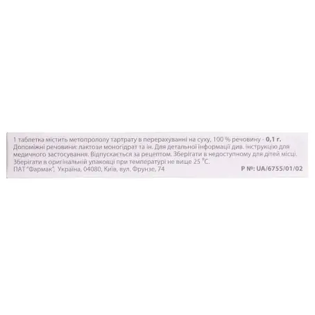 1 таблетка содержит метопролола тартрата 50 мг (0,05 г) или 100 мг (0,1 г) в перечислении на сухое 100% вещество;