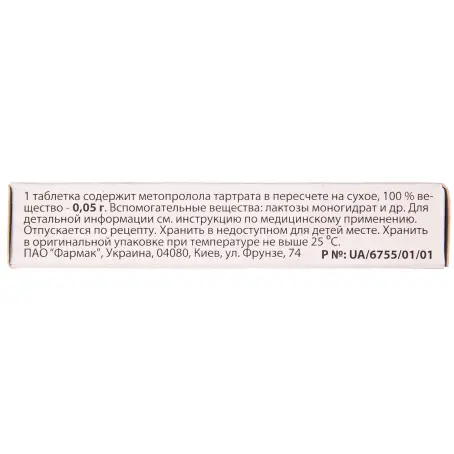 1 таблетка содержит метопролола тартрата 50 мг (0,05 г) или 100 мг (0,1 г) в перечислении на сухое 100% вещество;