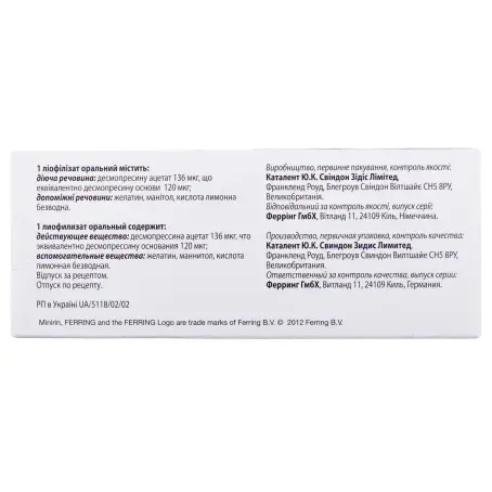 1 лиофилизат оральный содержит десмопрессина ацетата 68 мкг или 136 мкг, или 272 мкг, что эквивалентно десмопрессину основания 60 мкг или 120 мкг, или 240 мкг;