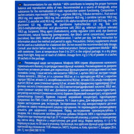 Миофолик MEN рекомендован в качестве дополнительного источника действующих веществ экстракта плодов Tribulus terrestris L., мио-инозитола, L-аргинина, L-карнитина, витаминов и минералов.