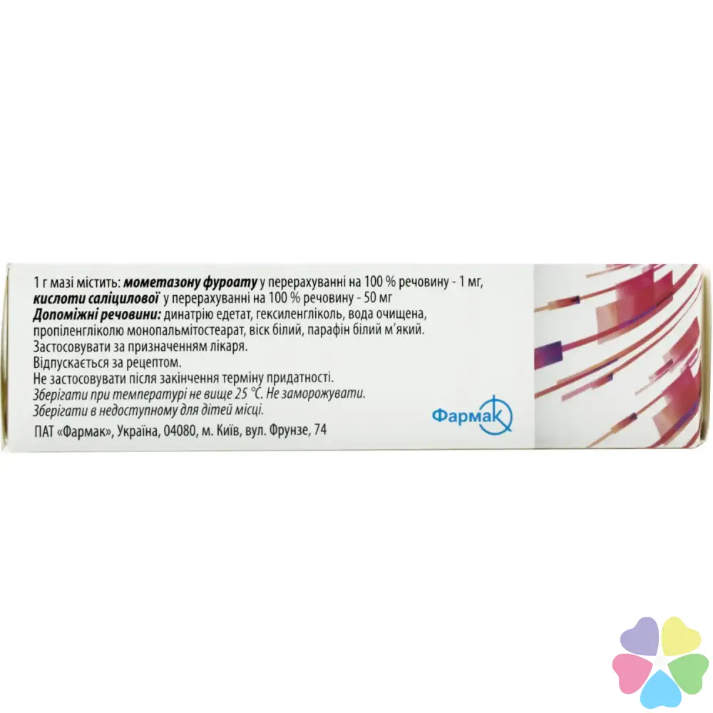 1 г мази содержит мометазона фуроата 1 мг в пересчете на 100% вещество, кислоты салициловой 50 мг в пересчете на 100% вещество;