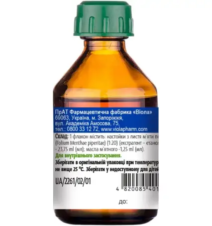 1 флакон содержит настойки из листьев мяты перечной (Folium Menthae piperitae) (1:20) (экстрагент - этанол 90%) - 23,75 мл масла мятного - 1,25 мл.
