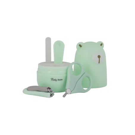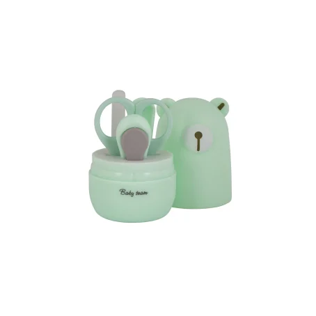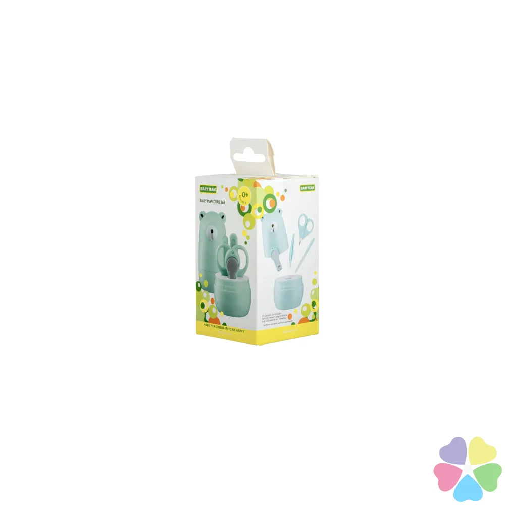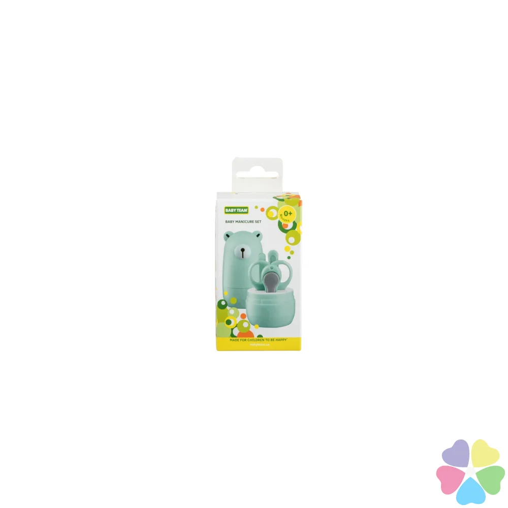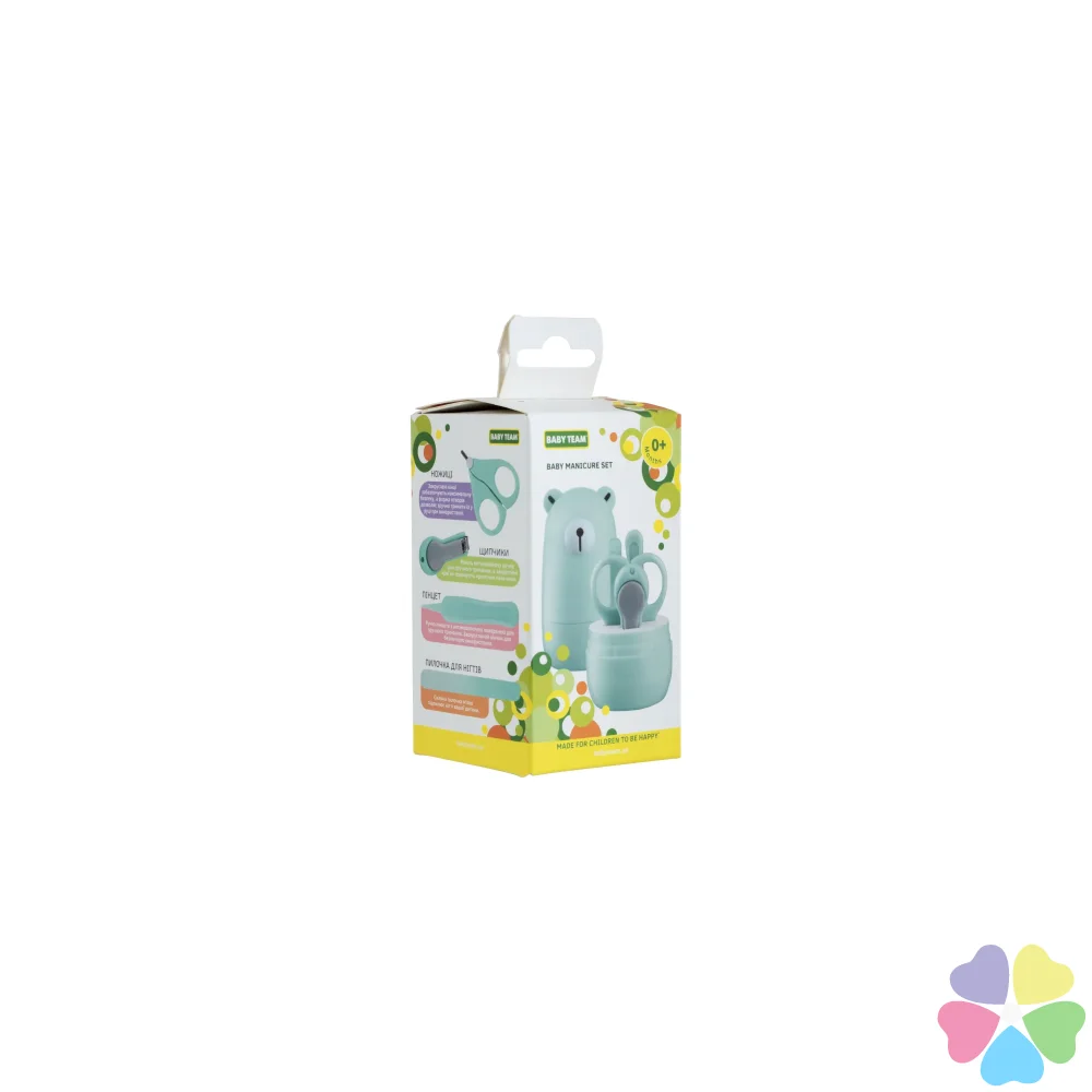 Набор маникюрный содержит: Ножницы из нержавеющей стали, имеющие лезвия с закругленными концами для максимальной безопасности, щипчики для ногтей с антискользящей ручкой, стеклянную пилочку, мягко подпиливающую ногти ребенок и пинцет с антискользящей поверхностью. Все предметы легко складываются в контейнер для удобного хранения, который можно брать с собой в дорогу.