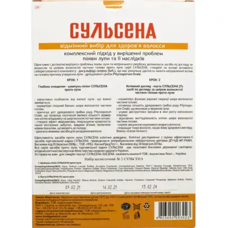 Шампунь Сульсена против перхоти: Вода, натрий лаурет сульфат, акрилатес кополимер, кокамидопропилбетаины, ПЭГ-7 глицерил кокоат, диметиконол, ТЭА -додецилбензенесульфонат, отдушка, дисульфид селена, гликоль дистеарат, коко-глюкозид, глицерил олеат, глицерил стеарат, салициловая кислота, лимонная кислота, триэтиленгликоль, бензиловый спирт, пропиленгликоль, метилхлороизотиазолинон, метилизотиазолинон.