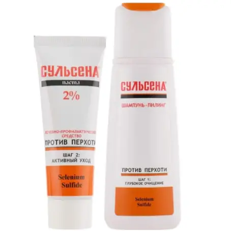 Паста Сульсена 2% против перхоти: Вода, цетиловый спирт, стеариловый спирт, натрий цетеарет сульфат, глицерин, калий цетеарет фосфат, дисульфид селена, отдушка, коричный спирт, ДМДМ гидантоин, лимонная кислота.