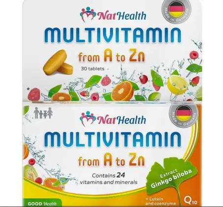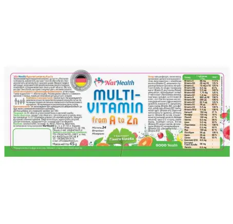Сбалансированный мультивитаминный комплекс NatHealth Multivitamin от А до Zn., содержащий 24 витамина и минералы, коэнзим Q10, экстракт Гинкго билоба и Лютеин, помогает организму быть здоровым ежедневно. Потребляя NatHealth Multivitamin от А до Zn, вы дополните свой дневной рацион важными витаминами, минералами и микроэлементами только в одной таблетке. NatHealth Multivitamin от А до Zn содержит экстракт Гинкго билоба, способствующий стимуляции внимания, мышления и памяти.