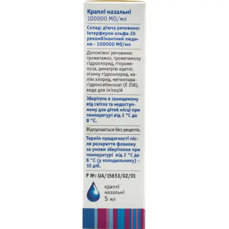 1 мл капель содержит интерферона альфа-2b рекомбинантного человека 100000 МЕ;