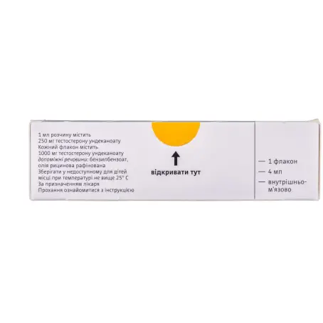 1 флакон содержит 1000 мг ундеканоата тестостерона в 4 мл раствора для инъекций (250 мг ундеканоата тестостерона/мл, что соответствует 157,9 мг тестостерона);