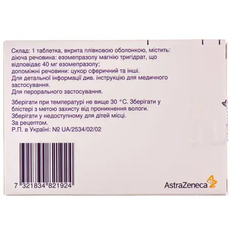 1 таблетка, покрытая пленочной оболочкой, содержит эзомепразол магния тригидрат, соответствующий 40 мг эзомепразола;