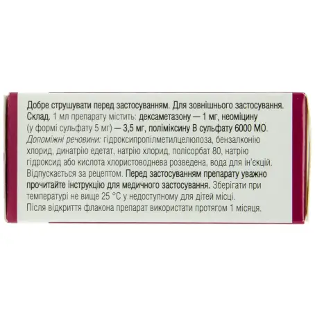 1 мл препарата содержит: дексаметазона - 1 мг; неомицина (в форме сульфата 5 мг) - 3,5 мг; полимиксина В сульфата - 6000 МЕ;