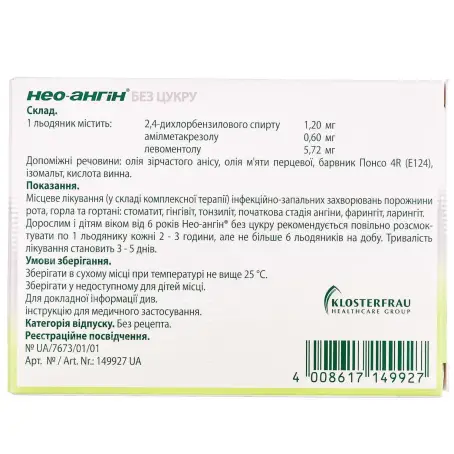 Способ применения и дозы.Взрослым и детям в возрасте от 6 лет Нео-ангин без сахара рекомендуется медленно рассасывать по 1 леденцу каждые 2 - 3 часа, но не более 6 леденцов в сутки. Продолжительность лечения составляет