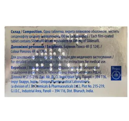 Или 1 таблетка содержит силденафила цитрата эквивалентно 100 мг силденафила;