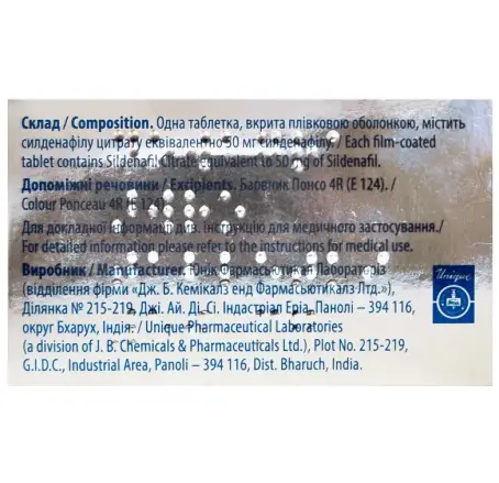 1 таблетка содержит цитрата силденафила эквивалентно 50 мг силденафила;