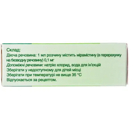 1 мл раствора содержит бензилдиметил[3-(миристоиламино)пропил]аммония хлорида моногидрата (в пересчете на безводное вещество) 0,1 мг;другие составляющие: натрия хлорид, вода для инъекций.