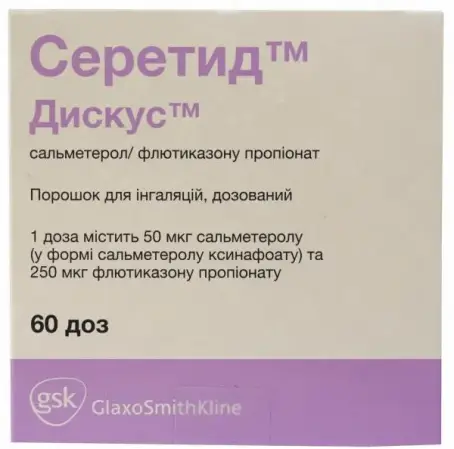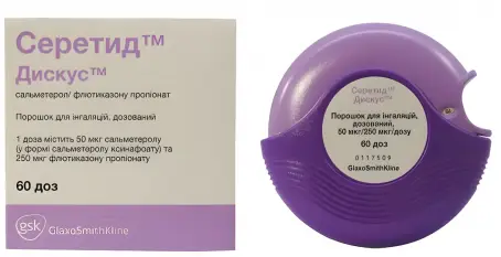 Порошок Серетид Дискус 250 мкг/50 мкг - используется для ингаляций, в качестве уменьшения проявлений аллергии, а также при различных заболеваниях дыхательной системы, например, астматических состояниях и бронхите. В упаковке находится 60 доз для ингаляционного употребления.