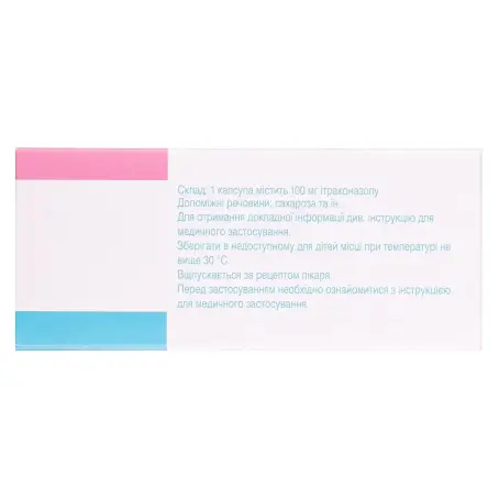 Пиковая концентрация в плазме крови после перорального применения итраконазола достигается от 2 до 5 часов. В результате нелинейной фармакокинетики итраконазол кумулируется в плазме крови после многократного применения. Состояние равновесных концентраций, как правило, достигается в течение 15 дней со значениями Сmax 0,5 мкг/мл, 1,1 мкг/мл и 2,0 мкг/мл после применения 100 мг 1 раз в сутки, 200 мг 1 раз в сутки. 200 мг 2 раза в день соответственно. Конечный период полувыведения итраконазола варьирует от 16 до 28 ч после однократной дозы и увеличивается до 34-42 ч после применения нескольких доз. После прекращения лечения концентрация итраконазола снижается до уровня, почти не проявляющегося в плазме крови, в течение 7-14 дней, в зависимости от дозы и продолжительности лечения. Средний плазменный клиренс итраконазол после внутривенного применения составляет 278 мл/мин. Благодаря насыщенному печеночному метаболизму при более высоких дозах клиренс итраконазола снижается.