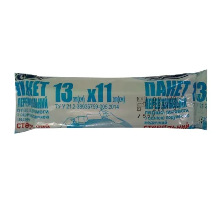 Перевязочная повязка останавливает кровотечение и защищает рану от инфекций. Представляет собой марлевый бинт размером 13 м х 11 см, к которому прикреплена одна ватно-марлевая подушечка, а вторую можно передвигать вдоль бинта.
