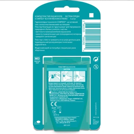 Пластырь Compeed Экстрим от мозолей средние, 5 штук можно купить в наших аптеках сейчас здесь: Свободы,  Ужвий, Закревского,  Оксиден,  Троещина,  Милославская, Оболонський 35,  Дримтаун 2,  метро Минская, Григоренко 5А, Метрологическая 14Б,  Парк Феофания,  Хрустальные источники, Бажана,  Апетит,  метро Осокорки, Кристер Град,  Куренёвка,  Виноградарь, Гатное,  Чабани,  Одесская, Березневая,  Соцгород,  Комфорт Таун 3,  Comfort Town 3, Грінвіль,  Мазепи,  Замарстыновская, Парк Авеню, Руданского, ЖК Фамилия,  Кульпарковская, Воскресенская, Гмирі,  Епіцентр, Иоанна Павла