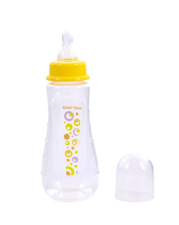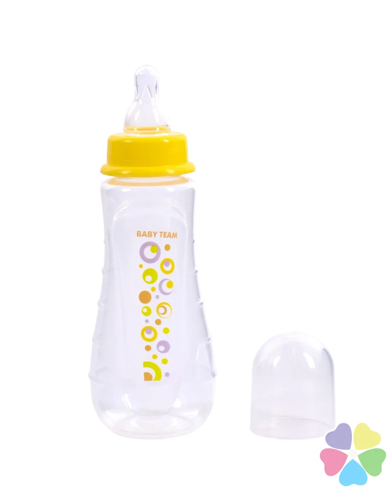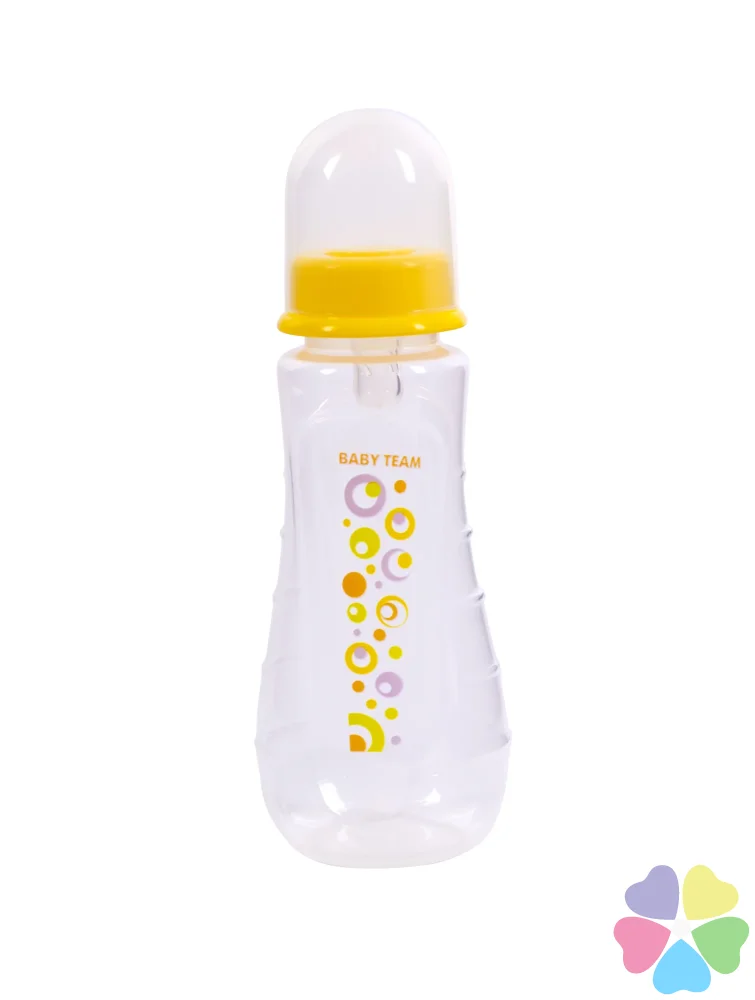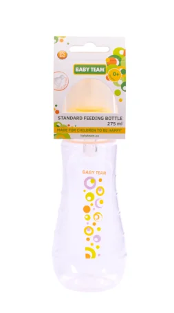 Яркая крышечка надежно защищает соску от загрязнения, а бутылочку от случайного открывания. Нанесенная на бутылочку рельефная мерная шкала не сотрется, даже во время постоянного пользования – вы всегда с легкостью сможете определить, сколько миллилитров жидкости осталось в бутылке. Благодаря эргономичной форме эту бутылочку комфортно держать, как взрослым, так и малышам, специальные «ребрышки» позволяют максимально удобно держать бутылочку и не ускользать, даже из мокрых рук. Все бутылочки Baby team изготовлены из высококачественных и безопасных материалов, а также не содержат вредных веществ и бисфенол А.