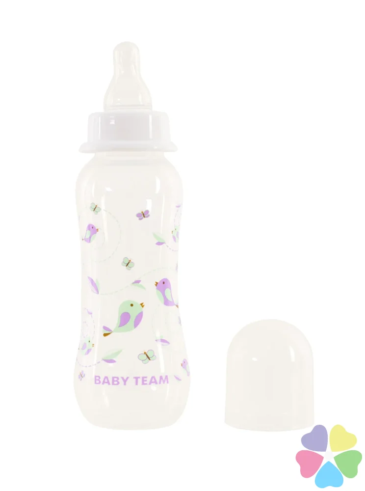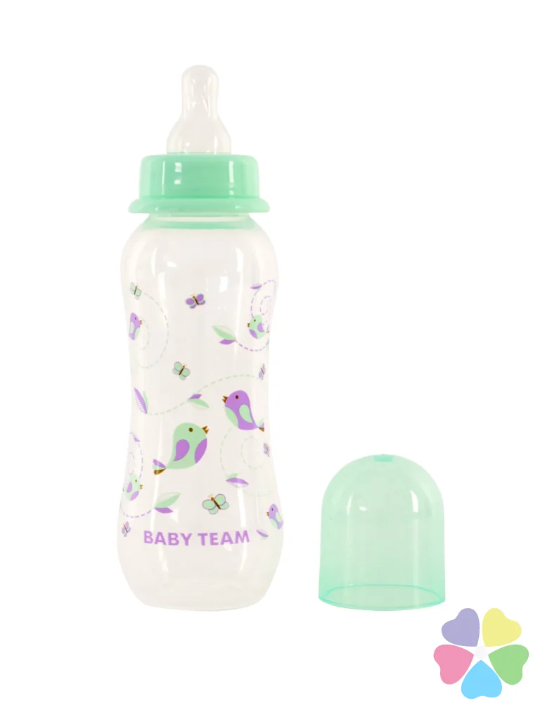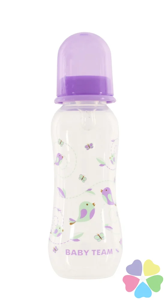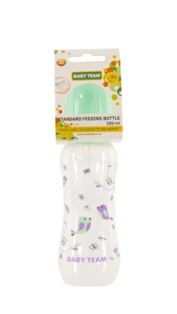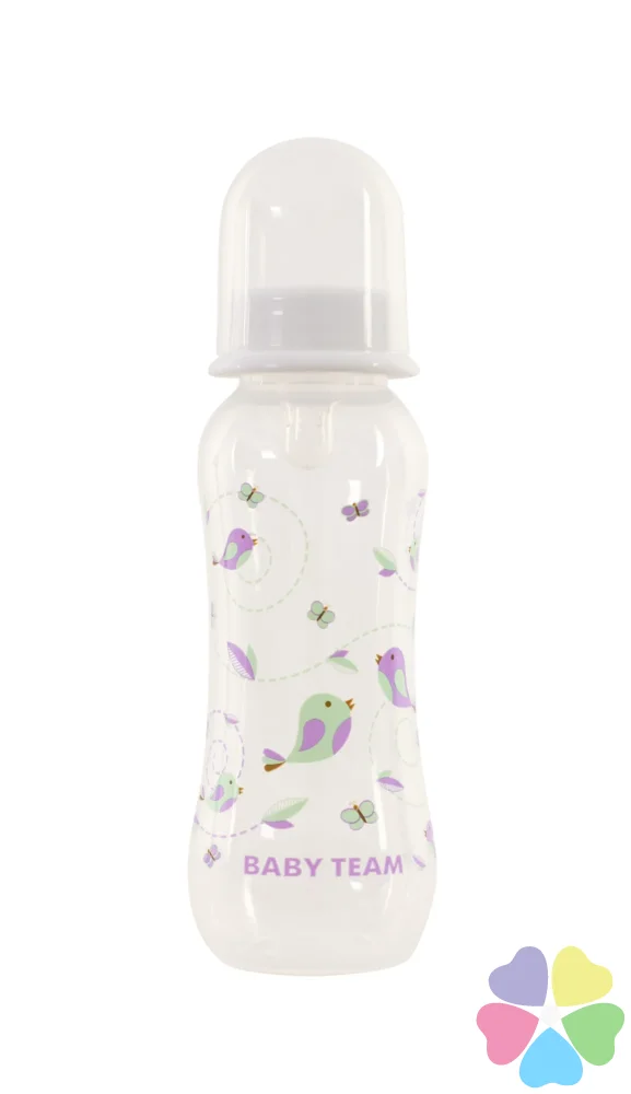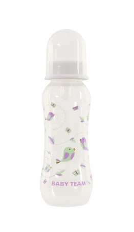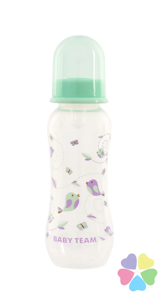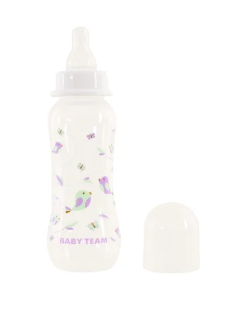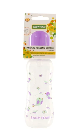 Яркая крышечка надежно защищает соску от загрязнения, а бутылочку от случайного открывания. Нанесенная на бутылочку рельефная мерная шкала не сотрется, даже во время постоянного пользования – вы всегда с легкостью сможете определить, сколько миллилитров жидкости осталось в бутылке. Благодаря эргономичной форме эту бутылочку комфортно держать, как взрослым, так и малышам – выемка посередине, так называемая «талия» позволяет максимально удобно держать бутылочку и не ускользать бутылочке, даже из мокрых рук. Все бутылочки Baby team изготовлены из высококачественных и безопасных материалов, а также не содержат вредных веществ и бисфенол А.