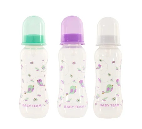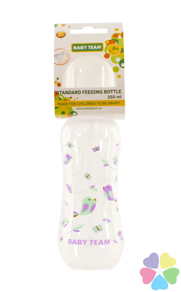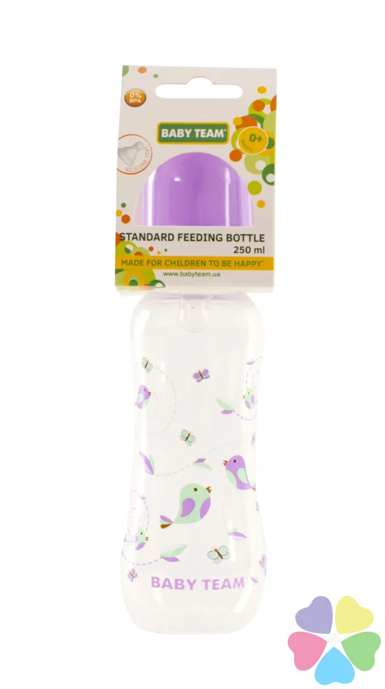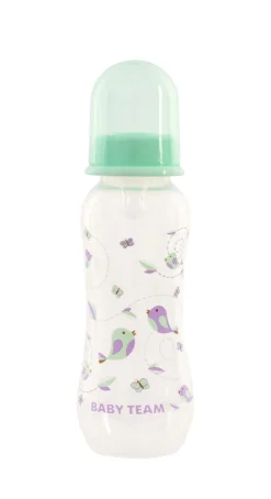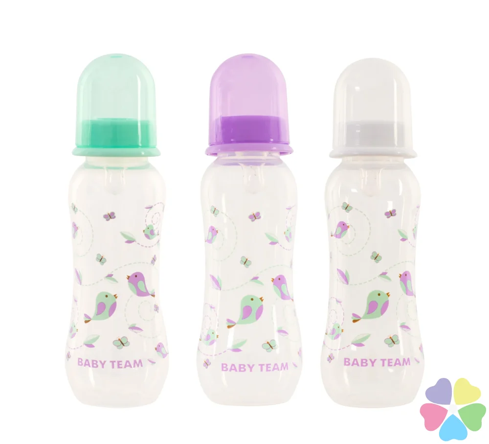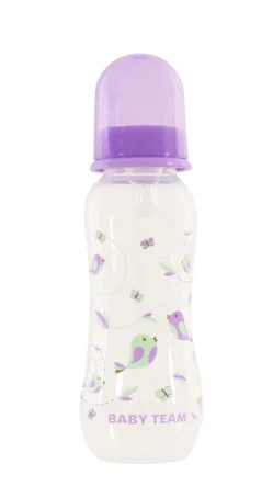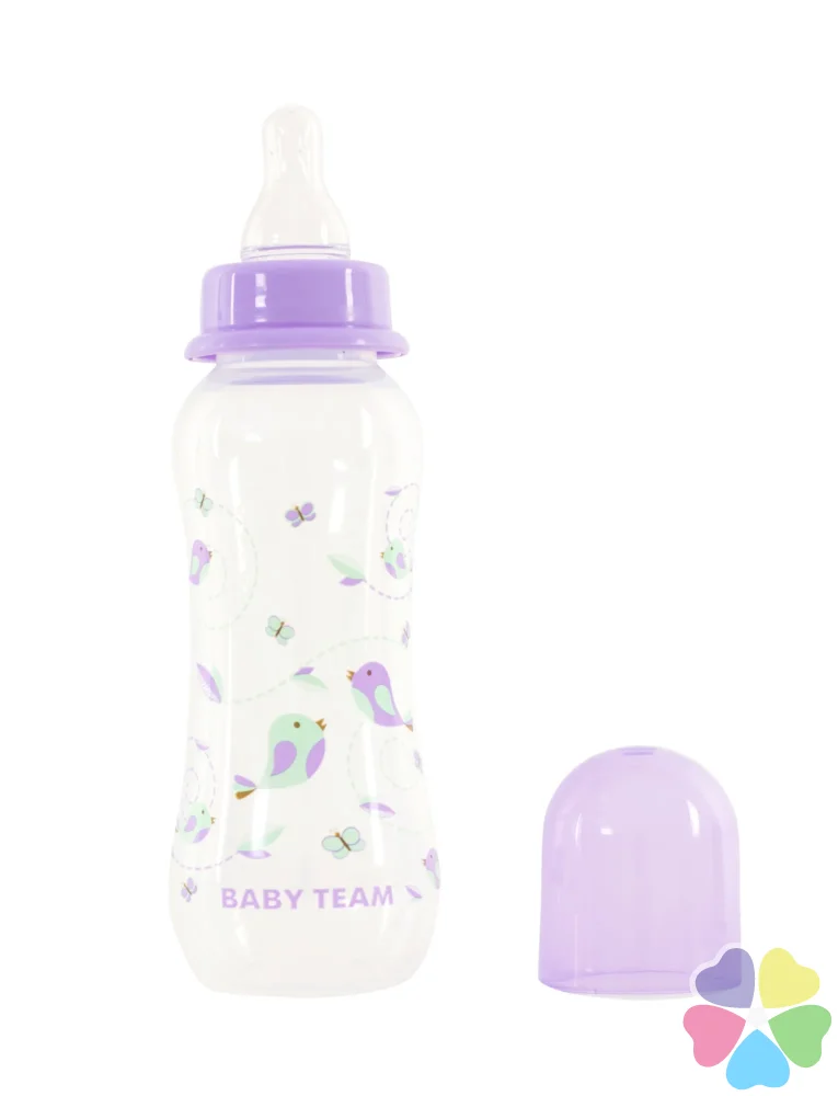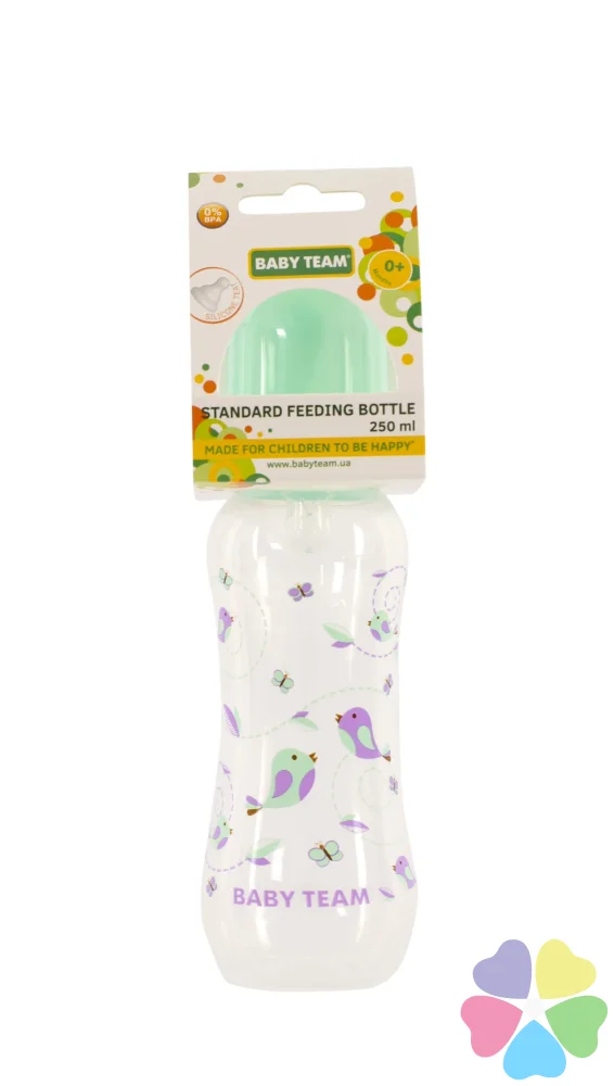 Яркая крышечка надежно защищает соску от загрязнения, а бутылочку от случайного открывания. Нанесенная на бутылочку рельефная мерная шкала не сотрется, даже во время постоянного пользования – вы всегда с легкостью сможете определить, сколько миллилитров жидкости осталось в бутылке. Благодаря эргономичной форме эту бутылочку комфортно держать, как взрослым, так и малышам – выемка посередине, так называемая «талия» позволяет максимально удобно держать бутылочку и не ускользать бутылочке, даже из мокрых рук. Все бутылочки Baby team изготовлены из высококачественных и безопасных материалов, а также не содержат вредных веществ и бисфенол А.