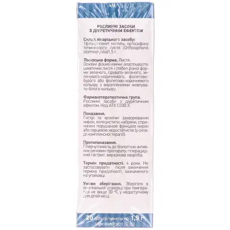 1 фильтр-пакет содержит: ортосифон тычиночных листьев ( Orthosiphonis staminei folia ) 1,5 г.