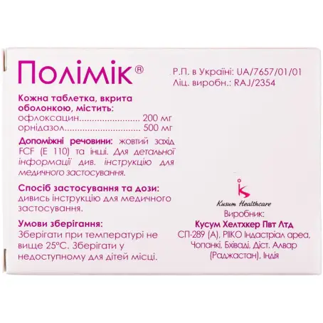 Полимик - комбинированное антимикробное и противопротозойное лекарственное средство, фармакологическое действие которого обусловлено свойствами компонентов, входящих в его состав: офлоксацина (производная хинолинкарбоновой кислоты) и орнидазола (производная 5-нитроимидазола).