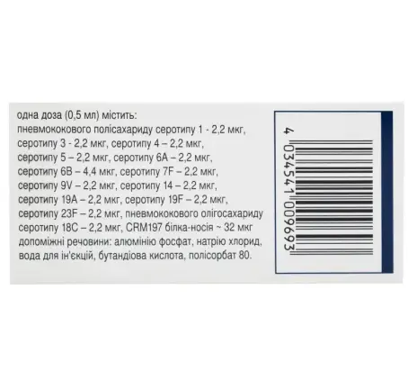 СоставДействующие вещества: пневмококковые полисахариды серотипов 1, 3, 4, 5, 6A, 6B, 7F, 9V, 14, 19A, 19F и 23F, олигосахарид серотипа 18C, белок-носитель CRM197;