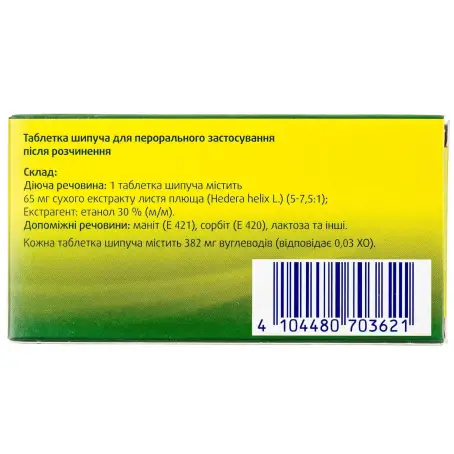 1 таблетка шипучая содержит 65 мг сухого экстракта листьев плюща(HederahelixL.) (5-7,5:1); экстрагент: этанол 30% (м/м);