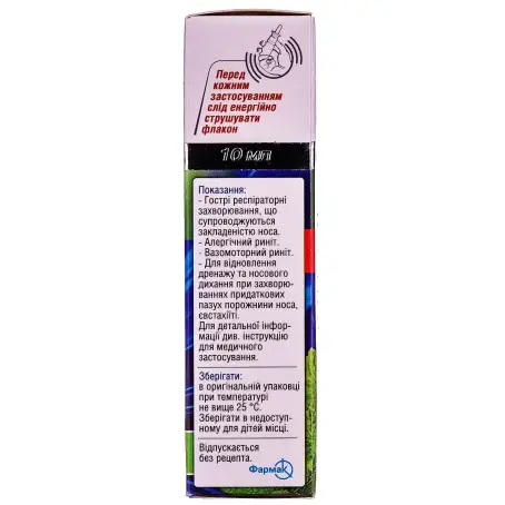 Перед каждым применением следует энергично встряхивать флакон из-за свойств средства густеть при хранении и разжижаться при взбалтывании. | Перед первым использованием дозирующего устройства несколько раз нажать на него до появления аэрозоля. | Вставить наконечник в носовой ход и нажать на дозирующее устройство, одновременно сделав глубокий вдох носом |