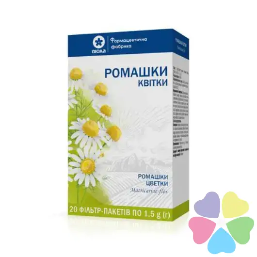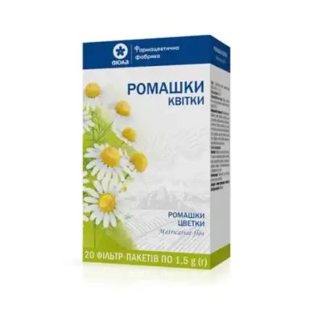 1 пачка содержит ромашки цветка (Matricariae flos) – 40 г или 50 г; 1 фильтр-пакет содержит ромашки цветка (Matricariae flos) – 1,5 г.