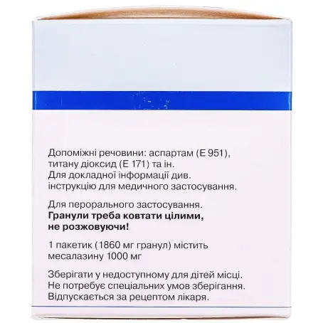 1 пакетик (930 мг гранул) содержит месалазин 500 мг или 1 пакетик (1860 мг гранул) содержит месалазин 1000 мг;