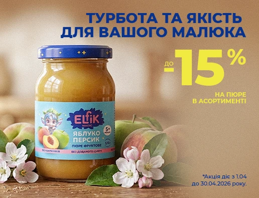 Пюре фруктовое Elfik Magic яблоко-персик, 170 г – это натуральный прикорм для малышей с 5 месяцев, изготовленный в Украине без добавления сахара, консервантов, красителей и ГМО.