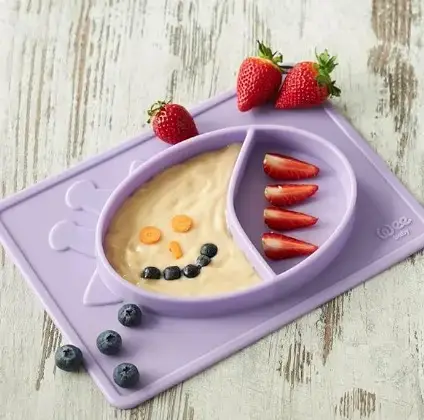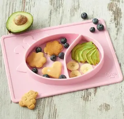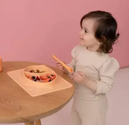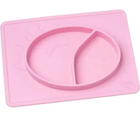 Силиконовая матовая тарелка розового цвета для еды.Благодаря двум разным отделениям, он дает возможность употреблять разные продукты, не смешивая их.Подставка под приборы предотвращает рассыпание еды.