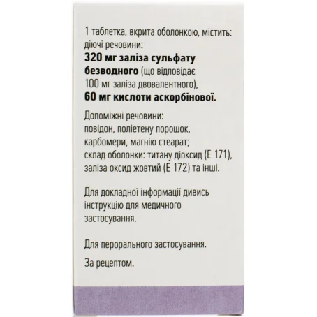 320 мг железа безводного сульфата (соответствующего 100 мг железа двухвалентного), 60 мг кислоты аскорбиновой;