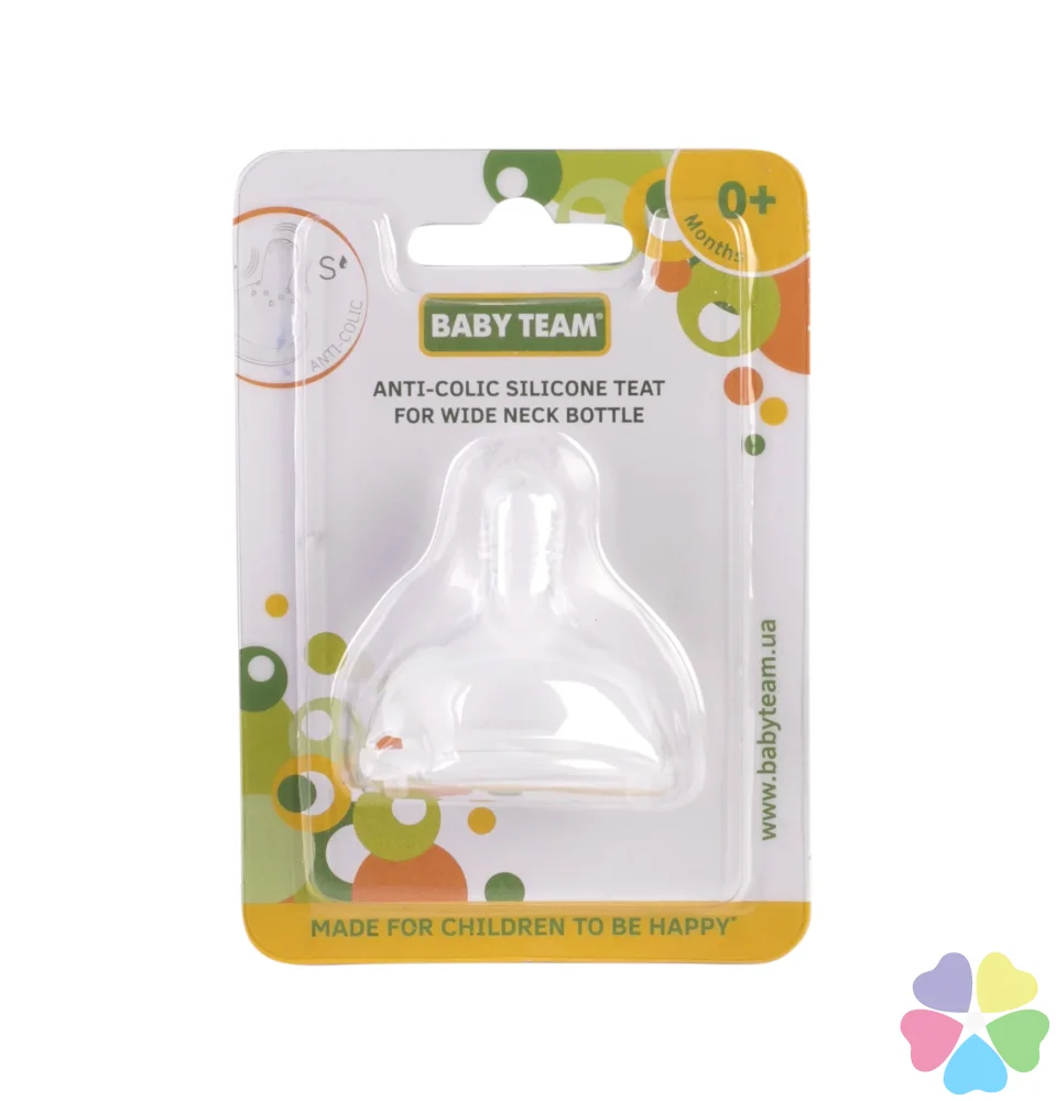 Подходит к бутылочкам с широким горлом. Максимально имитирует естественный процесс сосания. Специальная форма соски уменьшает вероятность возникновения коликов. Соски BABY TEAM изготовлены из высококачественных и безопасных материалов, а также не содержат вредных веществ.