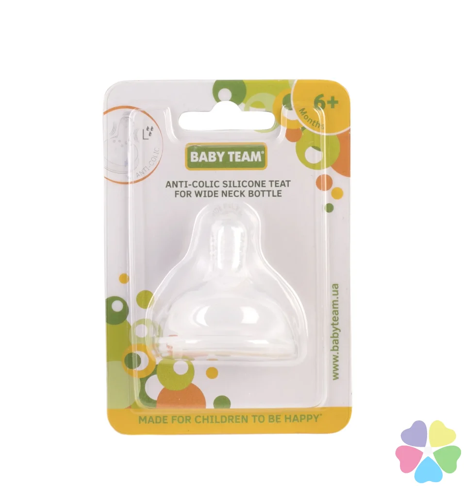 Подходит к бутылочкам с широким горлом. Максимально имитирует естественный процесс сосания. Специальная форма соски уменьшает вероятность возникновения коликов. Соски BABY TEAM изготовлены из высококачественных и безопасных материалов, а также не содержат вредных веществ.